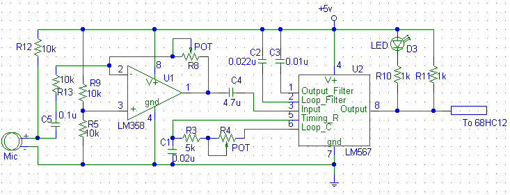 The circuit is based around two integrated circuits: An LM385 audio amplifier and the LM567 tone decoder IC. The LM385 is used to amplify the weak signal picked up by the condenser microphone, and the LM567 is used to filter the signal and provide a logic low when the signal is present.