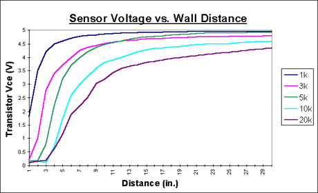 The project nature requires that the sensors have good resolution at relatively close ranges. Although the 10k and 20k Ohm resistors gave a smooth range of values between 3 and approximately 16 inches, it was decided that a low-range cut-off of 3 inches would not suffice. The 5k Ohm resistor performed better in that it gave a lower cut-off point of approximately 2 inches, while the 1k Ohm resistor failed to detect the wall at approximately 5 inches. The measurements show that a 3k Ohm resistor provides the perfect bias: A moderately smooth change in transistor voltage occur between 1.5 and 8 inches. Because the critical robot movements occur in the 18 inch-wide hallways and the robot is 12 inches wide, the side sensors will be able to accurately determine the distance to each wall.