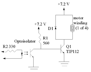 The current dissipating diode (or "free-wheeling diode") D1 is used so that the current stored in the motor coil does not damage the power transistor. When the transistor is turned off, the large magnetic field stored in the motor coil could generate a current spike through the collector to ground. The diode, however, will allow this potentially dangerous current to flow around the motor coil until it has been dissipated. The diode also helps to reduce the time it takes for the motor coil to switch from an "on" state to an "off" state. The speed at which a stepper motor can reliably rotate is relative to the amount of time it takes for a motor coil to switch states. By reducing the transition time, the stepper motor can be driven at higher frequencies resulting in a higher velocity. A small resistor in series with diode D1 has also been added to help reduce the transition time of the motor coil.